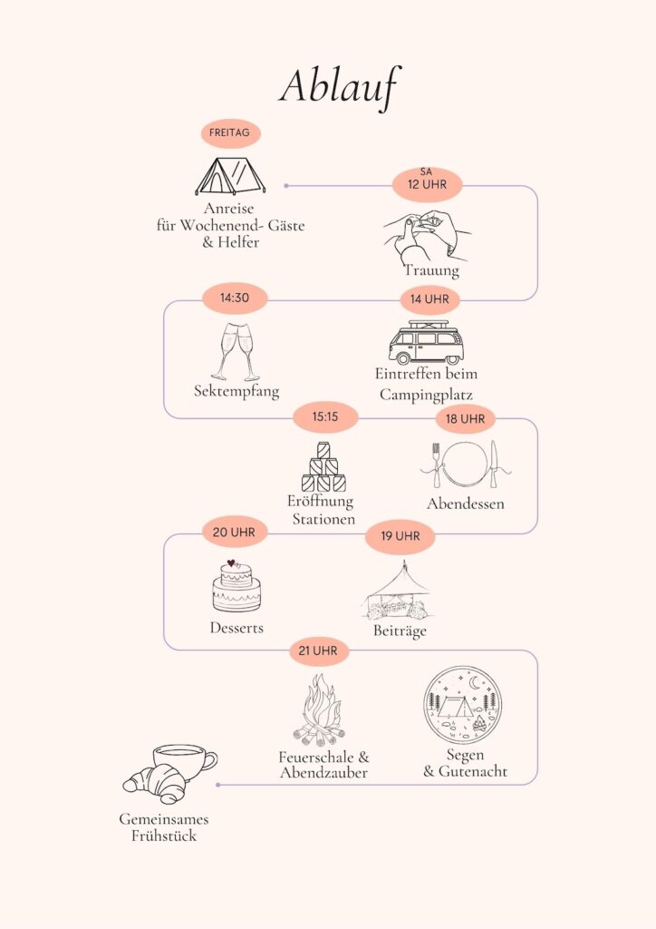 Die Hochzeit beginnt mit dem Gottesdienst und der Trauung in Ottenhöfen am Samstag um 12 Uhr. Anschließend werden wir gemeinsam zum Campingplatz fahren. Dort findet der Sektempfang und die weitere Feier statt.